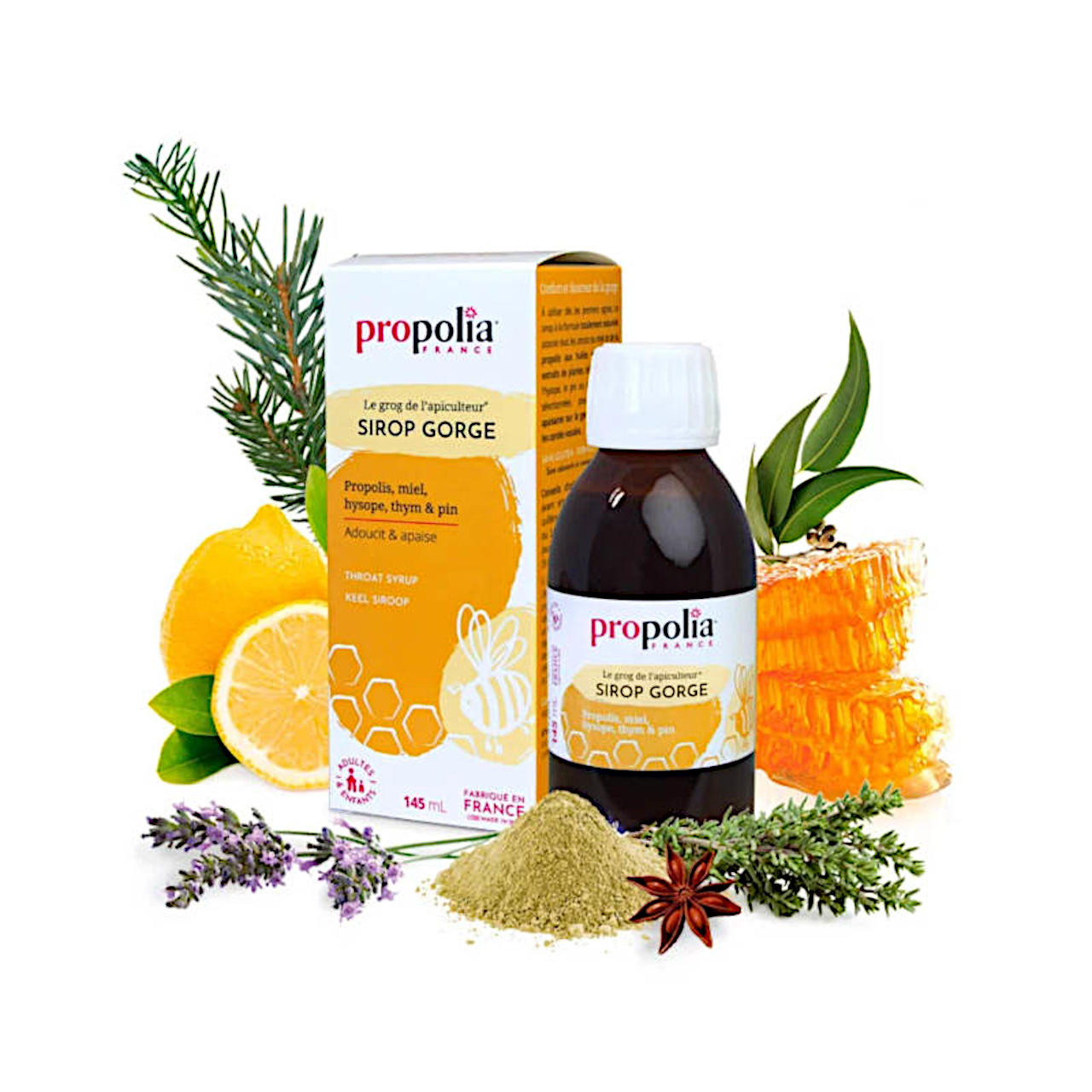 Inhaltsstoffe: Weizensirup (glutenfrei), Honig (24%), wässrige Pflanzenauszüge (21%) von Ysop, Pinie, Thymian, Lavendel, Sternanis, Mohn, Königskerze, Malve, Duftveilchen, gereinigter Propolisextrakt (3%), Essenzen von Zitrone, Pinie, Eukalyptus und Thymian.